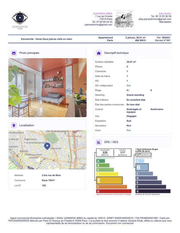 RUE DE NICE – 75011 – 36m2 PARFAIT 2 PIÈCES – 490 000€